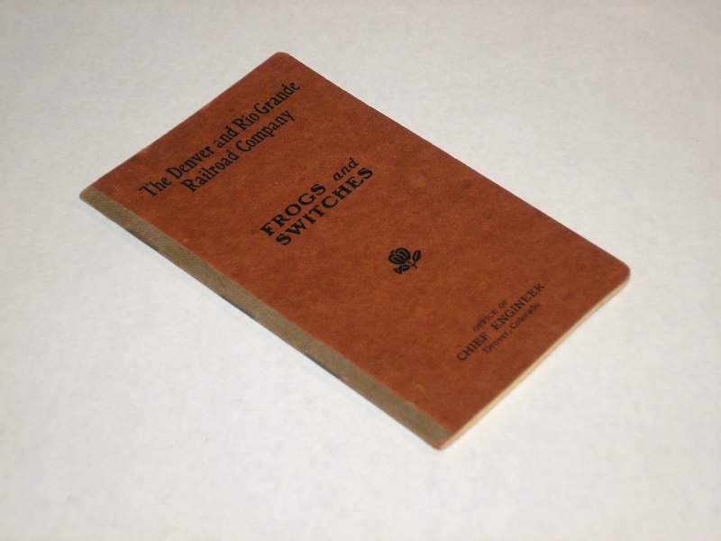 | 13309 | Office of Chief Engineer | Maintenance Of Frogs and Switches | Denver and Rio Grande Railroad Company | Good. Light soiling on the covers. | 4 x 6.5 inches, maintenance of railroad frogs and switches with tables, diagrams and line drawings. | Railroad | $40 |