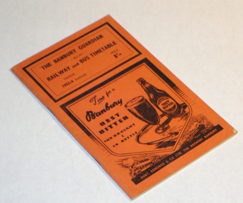 | 13484 | The Banbury Guardian | The Banbury Guardian "All-In" Railway and Bus Timetable Winter 1953/4 edition | The Banbury Guardian | Very good. Faint shelf wear. The last page has some writing. | 4.25 x 6.75 inches, timetables, with many interesting ads. | Railroad, Bus, The Banbury Guardian, England, ephemera | $20 |