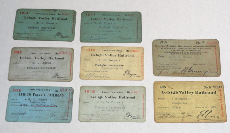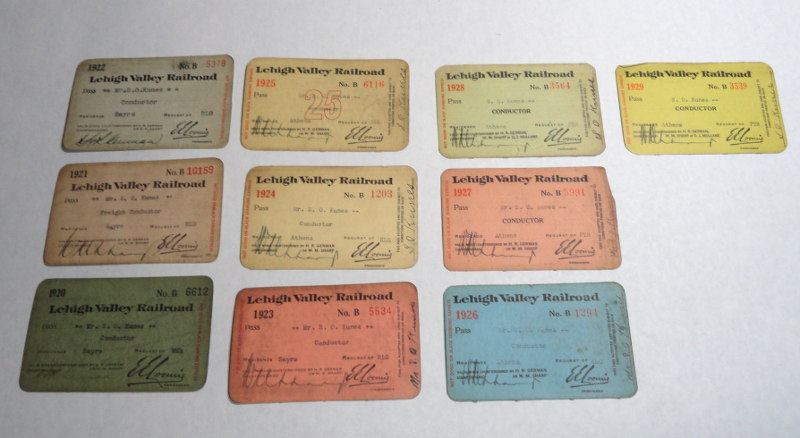 | 15365 | Lehigh Valley Railroad | Eight Lehigh Valley Railroad Passes - 1910 to 1919 | Lehigh Valley Railroad | Good. Some are 'billfold' soiled and worn. | Lehigh Valley Railroad passes. 1910, 1913, 1914, 1915,1916,1917, 1918 and 1919 . Conductor employee passes. | Railroad, Lehigh Valley, Railroadiana, ephemera | $35 |