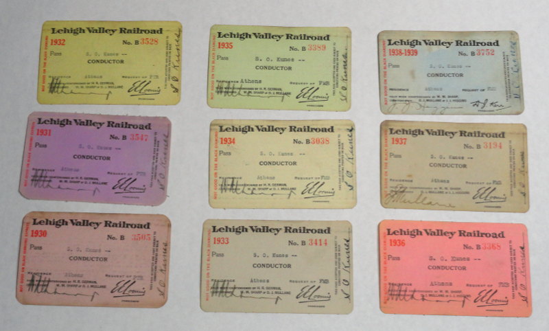 | 15367 | Lehigh Valley Railroad | Nine Lehigh Valley Railroad Passes - 1930 to 1939 | Lehigh Valley Railroad | Good. Some are 'billfold' soiled and worn. | Lehigh Valley Railroad passes. 1930, 1931, 1932, 1933,1934, 1935, 1936, 1937 and a combined 1938-9 . Conductor employee passes. | Railroad, Lehigh Valley, Railroadiana, ephemera | $35 |