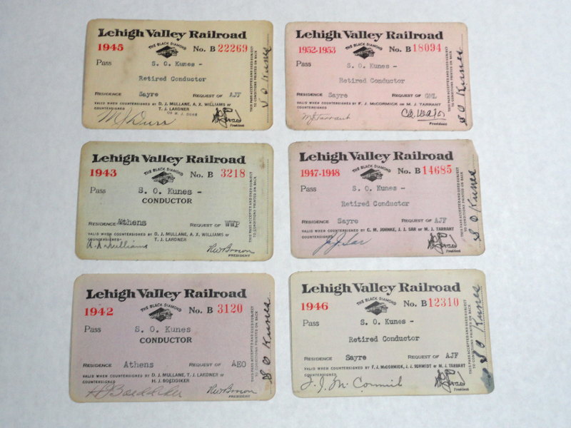 | 15368 | Lehigh Valley Railroad | Six Lehigh Valley Railroad Passes - 1942 to 1953 | Lehigh Valley Railroad | Good. Some are 'billfold' soiled and worn. | Lehigh Valley Railroad passes. 1942, 1943, 1945, 1946, 1947-1948 and 1952-1953. 1942 is a Conductor employee pass. The rest ate retired conductor passes. | Railroad, Lehigh Valley, Railroadiana, ephemera | $25 |