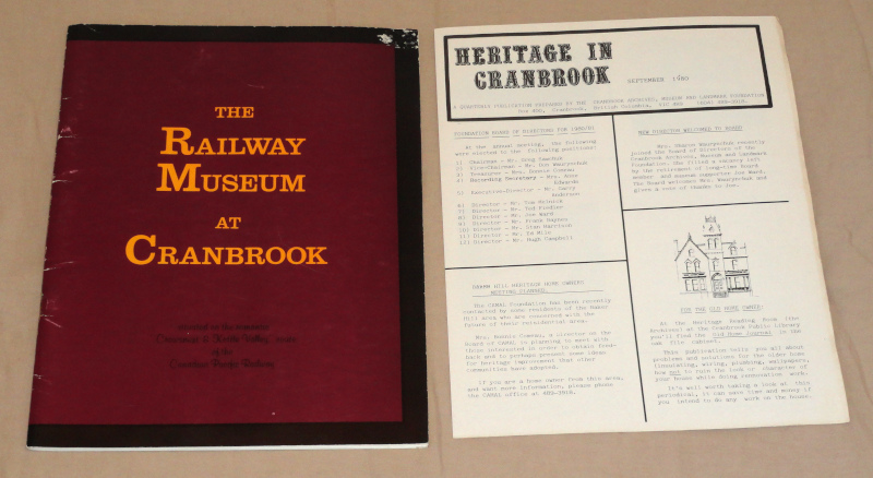 | 15823 | Anderson, Gary W. | The Railway Museum At Cranbrook | Cranbrook Archives, Museum & Landmark Foundation | Good. Price sticker removal mark on the front cover. Covers and spine show shelf wear. | 8.5 x 11 inches, the Canadian Pacific Railway at Cranbrook, British Columbia, Canada. There are photos and line drawings. Also included is an issue of "Heritage In Cranbrook", September, 1980. 4 pages with b&w photos. | `Canadian Pacific Railway, Railroad, Cranbrook, British Columbia, Canada. | $20 |