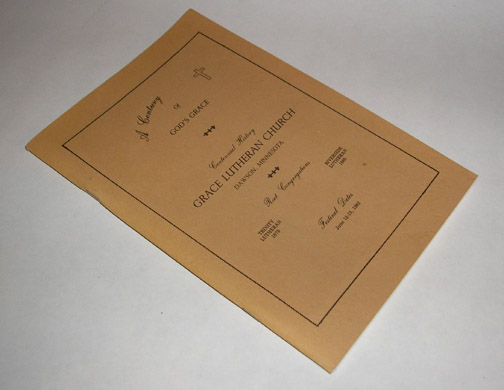 | 10627 | Staff | A Century of God's Grace Centennial History Grace Lutheran Church Dawson, Minnesota | Grace Lutheran Church | Very good. | 1982 6 x 9 inch stapled paperback with 80 pages and b&w photos. Church history. Trinity Lutheran and Riverside Lutheran. | Religion, Lutheran, Grace Lutheran Church, Dawson, Minnesota | $15 |