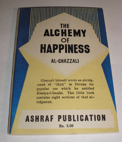 | 11150 | Al-Ghazzali | The Alchemy of Happiness | Ashraf Publication | Very good. | Al-Ghazzali was Muslim theologian and mystic of Persian origin. This book contains eight sections of an abridgment of his book "Ihya." There are eight pages of ads for other publications in back. | Islam, Sufism, Religion, Al-Ghazzali | $20 |