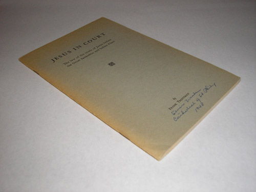 | 11941 | Troutman, Frank | Jesus In Court The Law of the Trials of Jesus Before The Great Sanhedrin and Before Pilate | Self-published | Good. The covers have light fading and soiling. Three lines of ink on the front cover under the author's name. "Senior Warden Cathedral of St. Philip 1948" A neat rubber stamp with the same info on the title page. Owner's name in ink. | Religion, Episcopal, Jesus in Court. | Religion, Episcopal, Cathedral of St. Philip, Atlanta, Georgia | $20 |