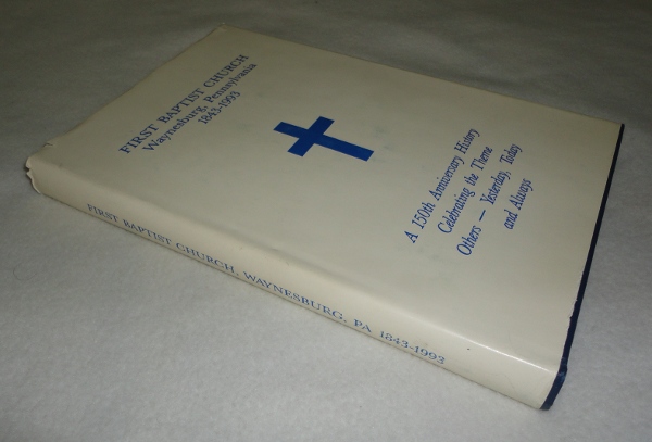 | 12272 | Smith, G. Wayne | The First Baptist Church Waynesburg, Pennsylvania 1843-1993 A 150th Anniversary History Celebrating the Theme Others-Yesterday, Today and Always | First Baptist Church, Waynesburg, Pennsylvania | Very good. Light shelf wear. In a good dust wrapper that has a few short tears along the edges. | A history of the First Baptist Church in Waynesburg, PA, with many pictures , a list of current members and a long index. | Religion, Christianity, Baptist, First Baptist Church, Waynes Burg, Pennsylvania, History | $50 |