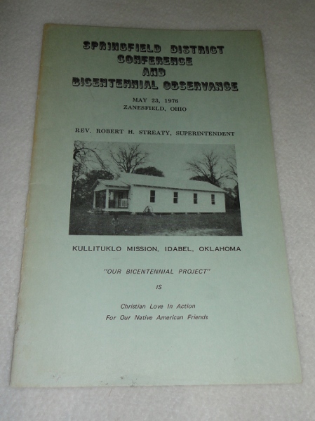 | 12309 | Streaty, Robert H., Superintendent | Springfield District Conference Bicentennial Observance May 23, 1976 Zanesfield, Ohio | The Springfield District United Methodist Church | Good. Light soiling on the covers. | A 5.25 x 8.25 inch stapled brochure with a short history of the Springfield, Ohio, Methodist Conference. Champaign, Clark, Logan, and Union Counties, with a list of abandonded churches as well. | Religion, Methodism, Springfield District, Ohio, history, ephemera | $20 |