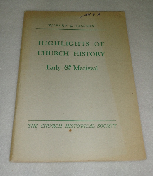 | 12336 | Salomon, Richard G. | Highlights of Church History Early & Medieval | The Church Historical Society | Good. The front cover has a fade mark and 3 ink letters. Light shelf wear. | A history of the Episcopal Church. 5 x 7 inch stapled paperback. | Religion, Episcopal. | $20 |