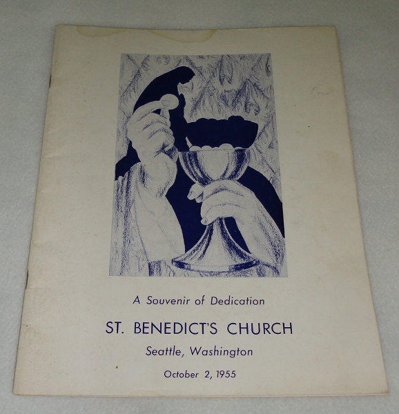 | 12365 | St. Benedict's Staff | A Souvenir of Dedication St. Benedicts Church Seattle, Washington October 2, 1955 | St. Benedict's | Fair. The top of the front cover and the first 18 pages have moisture stains. | 8.5 x 11 inch souvenir of dedication for St. Benedict's Church in Seattle, Washington. There are numerous pictures and advertisements. | Religion, Washington State, Catholicism, St. Benedict's Church | $20 |
