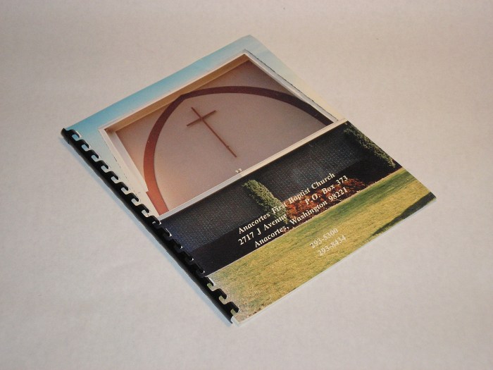 | 13107 | Staff | Anacortes First Baptist Church | Self-Published | Good. Covers and pages have light crease marks and soiling. | 7.5 x 9.5 church directory for Anacortes First Baptist Church, Anacortes, Washington State, in the 1980s. | Washington State, Anacortes, church directory, Anacortes First Baptist, religion, ephemera | $20 |