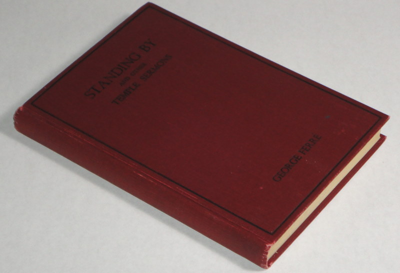| 14325 | Ferre, George | Standing By And Other Temple Sermons | Conference Press | Good. Top and bottom of spine have some wear. No dust wrapper. | Sermons by George Ferre, minister, The Swedish Temple, Boston. | Religion, sermons. | $35 |
