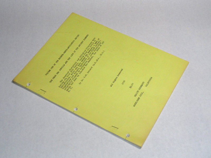 | 15141 | Bernard, Dr. R.W. | Volume One Of The Essene-Jesus-Apollonius Series The Dead Sea Scrolls And The Life of the Ancient Essenes | Health Research | Good. Staple marks | 8.5 x 11 inches, 38 stapled pages on the Dead Sea Scrolls. The last few pages are lists of Health Research publications. | Religion, Dead Sea Scrolls | $30 |