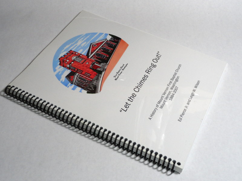 | 15307 | Pierce, Ed Jr., and Leigh W. Wilson | "Let the Chimes Ring Out!" A History of Mount Vernon First Baptist Church | Self-published | Very good. | 8.5 x 11 inch spiral bound, a history of the Mount Vernon, WA First Baptist Church - 1884-2007. There are many b&w photos. | Religion, Mt. Vernon, WA, First Baptist Church | $25 |