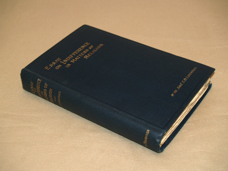 | 16313 | De Lamennais, Abbe F. | Essay On Indifference In Matters Of Religion | John Macqueen | Good. Occasional spotting on the pages. | Catholicism, Religion | Catholicism, Religion | $40 |