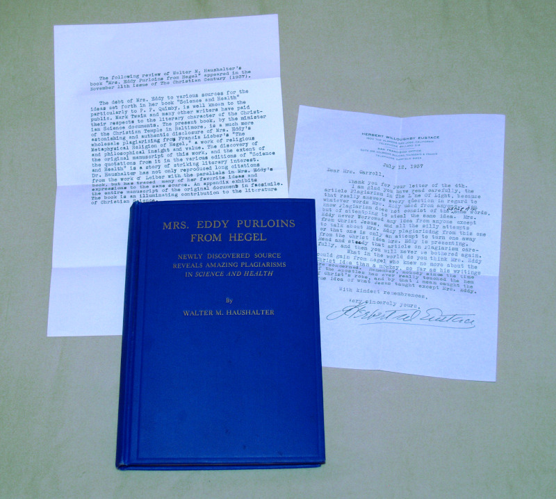 | 16335 | Haushalter, Walter M. | Mrs. Eddy Purloins From Hegel | A. A. Beauchamp | Very good. Faint shelf wear. Owner's name and address. No dust wrapper. | Anti Christian Science. Included is an interesting 1937 letter from Herbert Willoughby Eustace who replies to a Mrs. Carroll, that Mrs. Eddy's doctrine was from Christ and not from Hegel. Also included is a typed copy of a review of the book in "The Christian Century." Mr. Eustace was excommunicated from the church in 1922. | Christian Science, Mary Baker Eddy, Hegel, religion | $75 |