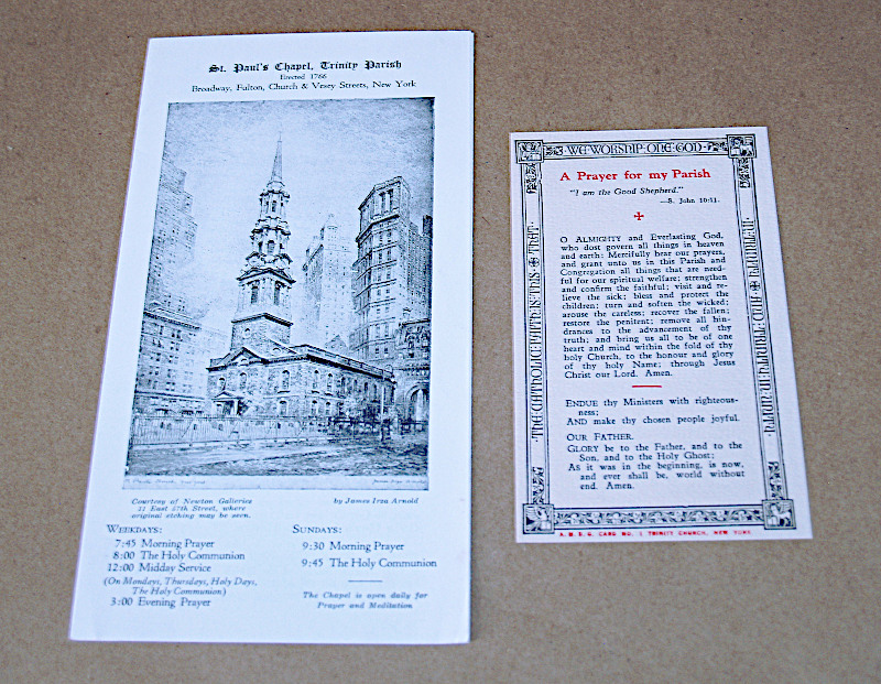 | 17025 | Staff | St. Paul's Chapel, Trinity Parish, brochure and prayer | St. Paul's Chapel, Trinity Parish | Very good. | 13 x 8.25 3 fold brochure with church history. There's a separate 'A Prayer for my Parish' Episcopal | Religion, Episcopal, St. Paul's Chapel, New York | $25 |