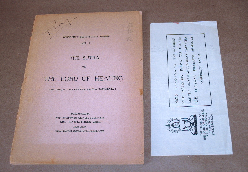 | 17068 | The Society Of Chinese Buddhists | Buddhist Scripture Series No. 1 The Sutra Of The Lord Of Healing | The Society Of Chinese Buddhists | Good. Name in ink on the front cover. Covers and spine have chipping and short tears. Yellowing pages. Fragile. | 17.5 x 6 inch fold out of Buddha in the back. Translation by Dr. phil. Walter Liebenthal | Religion, Buddhism, Sutra of Healing | $100 |
