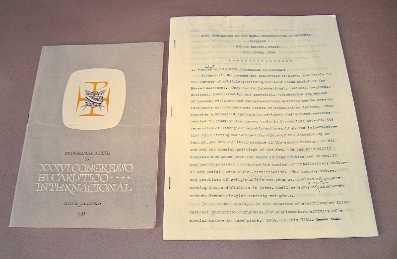 | 17092 | Staff | Programa XXXV! Congresso Eucaristico Internacional Rio De Janeiro Brasil | Catholic Church | Good. Sharp horizontal crease (folded), 3 pages have ink. | In Portuguese. 6.25 x 9 inches. Also included is a 17 page (8.5 x 11 double space typed) anon. manuscript: "Some Impressiions of the 36th International Eucharistic Congress, Rio De Janeiro, Brazil July 17-24, 1955." | Religion, Catholic, Eucharistic conference, Brazil | $50 |