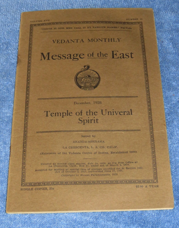 | 17154 | Staff | Vedanta Monthly Message of the East Volume XVII Number 10 December, 1928 | Amanda-Ashrama | Good. Light creasing and impact marks on the covers and pages. Rusty staples. | Religion, Hindu. There are 10 articles/items. | Religion, Hindu | $25 |