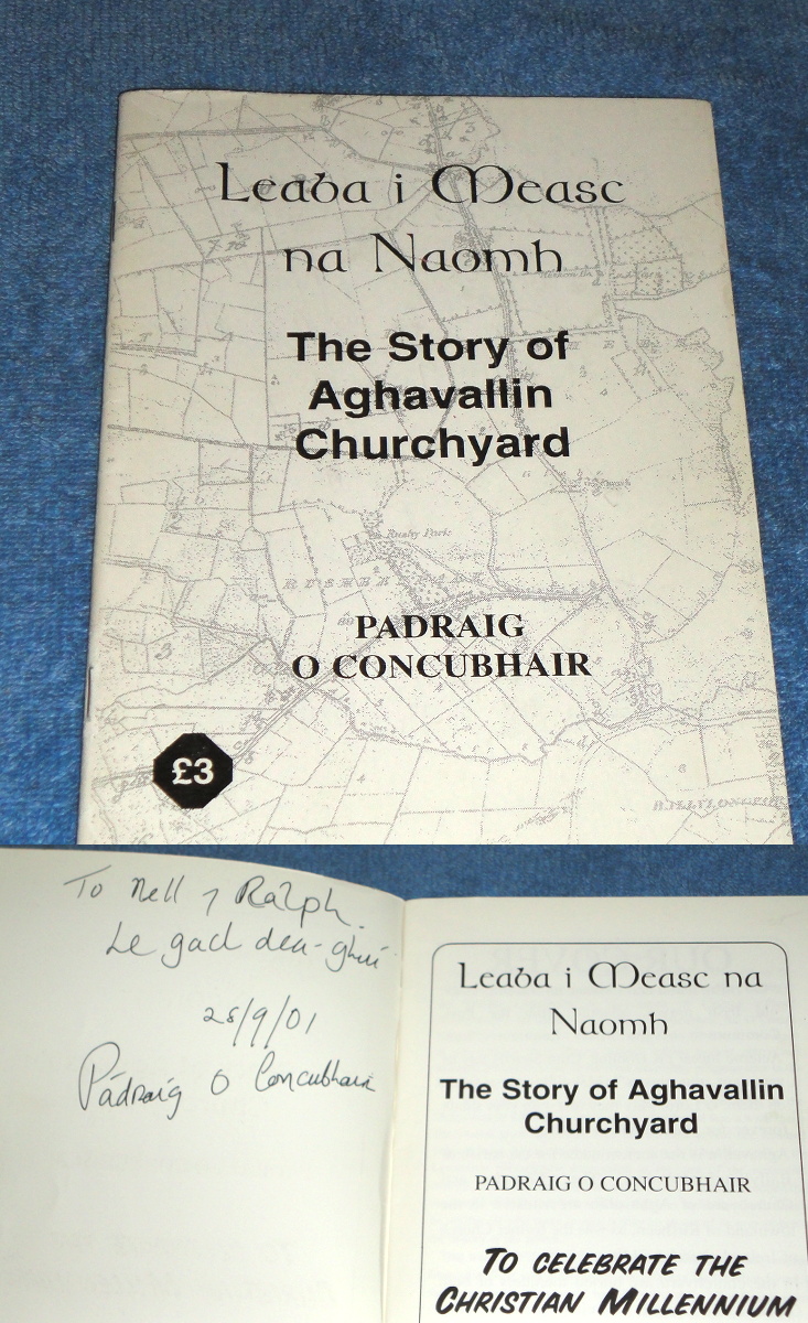| 17444 | Concubhair, Padraig O | Leaba i measc naomh | Self-published | Good. A bit of soiling on the back cover. | The Story of Aghavallin Churchyard. Inscribed and signed by the author. There are b&w photos. | Religion, Catholic, Irish, Aghavallin | $40 |