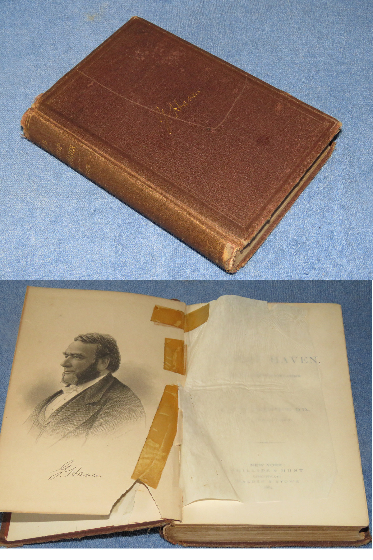 | 17514 | Prentice, George, D.D. | The Life of Gilbert Haven Bishop of the Methodist Episcopal Church | Phillips & Hunt | Fair. Covers and spine are worn and scraped. The front flyleaf and first 4 pages have ugly, very old, tape repairs. The rest of the contents are very good. No dust wrapper. | Bishop Haven was against Slavery and considered progressive about women's rights. | Religion, Methodist Episcopal | $40 |