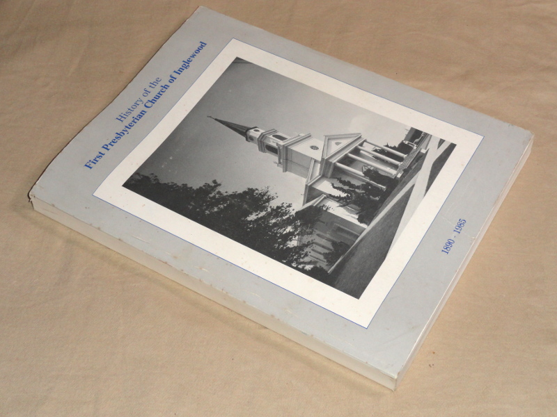 | 6564 | Waddingham, Gladys | History of The First Presbyterian Church of Inglewood 1890 through 1984 | Instant Print 1984 8.5 X 11 inch paperback, signed by Waddingham, 276 pages, photos, etc. | Fair to good. A one inch tear in the bottom center of the front cover. Folded page corners and creases. Back cover has two very small edge tears. | History of The First Presbyterian Church of Inglewood 1890 through 1984. Many b&w photos and lists. | Religion, First Presbyterian Church of Inglewood | $20 |