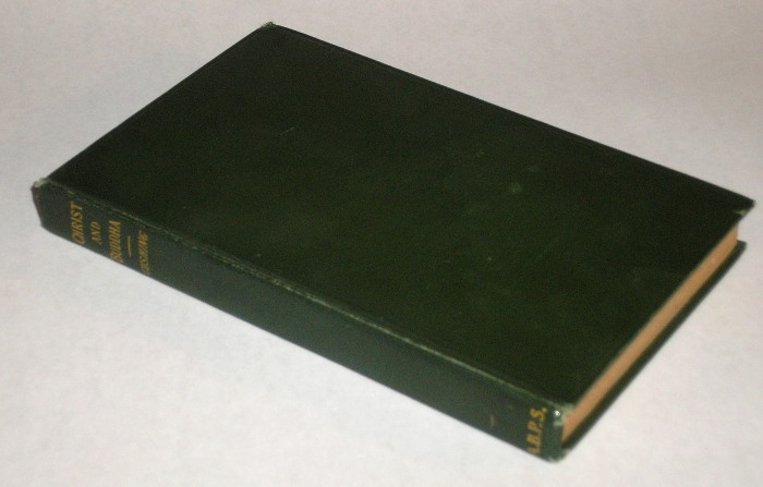 | 8692 | Cushing, Josiah Nelson | Christ and Buddha | American Baptist Publication Society | Good. Covers are a bit soiled and stained. Corners are a little worn. Library/book plate inside (no spine markings), Owner's 3 line name and address inside. Remains of a date due sheet in back. No dust wrapper. | 1907 with 160 pages and an index. Religion, Christianity, Buddhism, India. | Religion, Christianity, Buddhism | $20 |