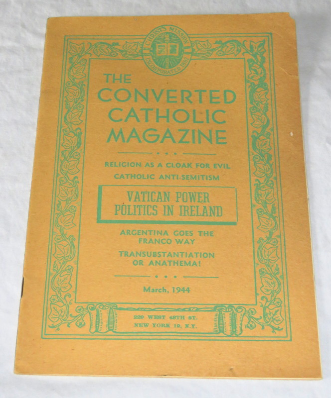| 17195 | Lehmann, L. H. | The Converted Catholic Magazine Vol. 5, No. 3, March 1944 | Christ's Mission | Good. Tiny holes and ad chip on the front cover, back cover corner missing. | 6 x 9 inches. "Catholic Anti-Semmitism, Vatican Power Politics in Ireland, Argentia Goes The Franco Way...." | Religion, Anti-Catholic, Ireland, Argentina, South America | $20 |