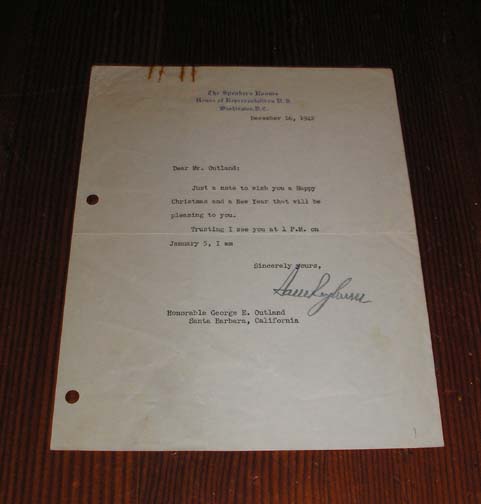 | 10807 | Rayburn, Sam | Letter to George E. Outland with a "The Speaker's Rooms House of Representatives U. S. letterhead. | self | Fair to good with 4 staple removal marks, rust imprints of two staples, light creasing and soiling. Two holes punched in margin. Three lines of ink notation (not related to Rayburn) on the back. | 7 x 9 inchs, one page, December 16, 1942, a signed letter from Texas Congressman Sam Rayburn, as speaker of the United States House of Represtentatives, to California congressman George Outland wishing him a happy Christmas and New Year. | Autograph, Sam Rayburn, Texas, politics | $300 |