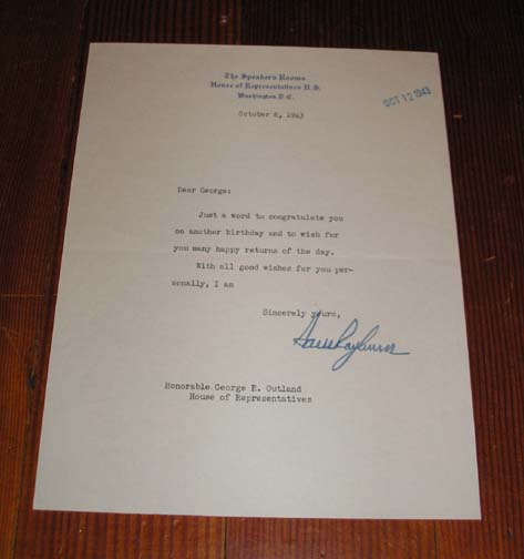 | 10808 | Rayburn, Sam | Letter to George E. Outland with a "The Speaker's Rooms House of Representatives U. S. letterhead. | self | Very good. Horizontal fold crease. Date ink stamp. | 7 x 9 inchs, one page, October 8, 1943, a signed letter from Texas Congressman Sam Rayburn, as speaker of the United States House of Represtentatives, to California congressman George Outland wishing him a happy birthday. | Autograph, Sam Rayburn, Texas, Politics | $400 |