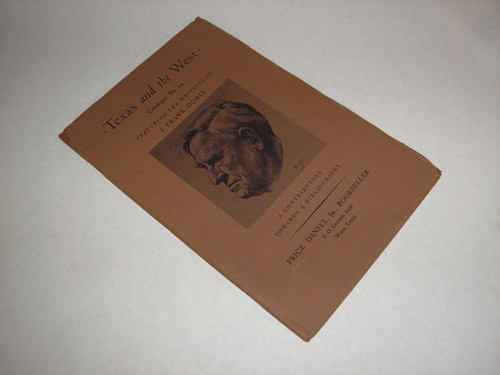 | 11761 | Daniel, Price, Jr. | Texas and the West Catalogue No. 24 Featuring The Writings Of J. Frank Dobie | Price Daniel Jr. | Good. Minor wear and soiling on the covers. Two faint stains on the top of the back cover. | 6 x 9 inches with a forward by Jeff C. Dykes, "J. Frank Dobie and His Books," and "Mr. Southwest" by Lawrence Clark Powell. There's also an index. | Print media, Book catalogue, Price Daniel Jr., Americana, Texas. J, Frank Dobie, bibliography | $25 |