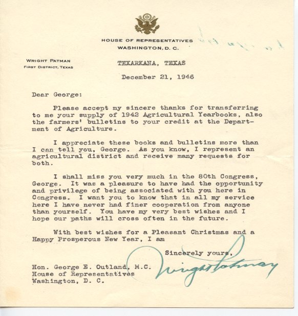 | 12524 | Patman, Wright | Wright Patman letter of thanks to George E. Outland On a House of Representatives Letterhead | self | Good. Ink ghost mark from another signature. | 6 x 7.5 inches, a thank you note to Congressman George Outland for transferring his supply of 1942 Agricultural Yearbooks. He writes from Texarkana, Texas. | Autograph, Wright Patman, U. S. House of Representatives, Texas | $50 |
