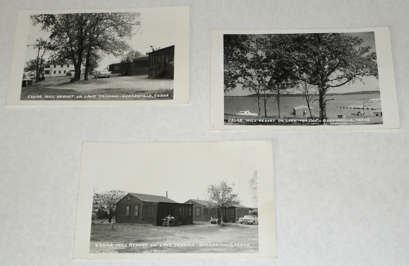 | 13527 | Anon. | Cedar Mill Resort On Lake Texoma, Gordonville, Texas, 3 real picture postcards | Anon. | Very good. | Three real picture postcards of Cedar Mill Resort On lake Texoma, Gordonville, Texas. Written on the back of the cards is vacation, May, 1958. A 1957-8 Plymouth is parked in front in one picture. | Cedar Mill Resort, Lake Texoma, Gordonville, Texas, Photography, ephemera | $20 |