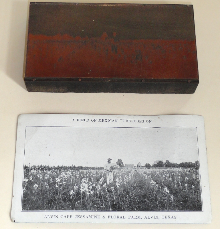 | 15769 | Staff | Alvin Cape Jessamine & Floral Farm Field of Mexican Tuberoses Photo & Plate | Alvin Cape Jessamine & Floral Farm | Good. Light wear. | A 6 x 3.5 inch b&w photo of Mexican tuberoses from the Alvin Cape Jessamine & Floral Farm, Alvin Texas, and the printing plate for it. | Alvin, Texas, ephemera | $25 |