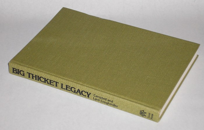 | 8776 | Loughmiller, Campbell and Lynn | Big Thicket Legacy | University of Texas Press | Good. Front edge of front cover has 4 shallow impact marks. Owner's name in ink inside. No Dust wrapper. | 1977 hardback with 222 pages and b&w photos. Big thicket, Texas | Texas, Big Thicket, TX | $20 |