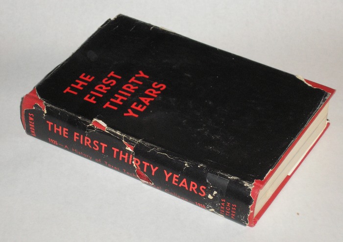 | 8845 | Andrews, Ruth Horn | The First Thirty Years A History Of Texas Technological College 1925 - 1955 | the Texas Tech Press | Very good with light shelf wear. Owner's name in ink inside. In the remains of a dust wrapper. | 1956 limited, numbered, signed by the author, with 393 pages, b&w photos, index. | History, Texas Technological College, Texas | $20 |
