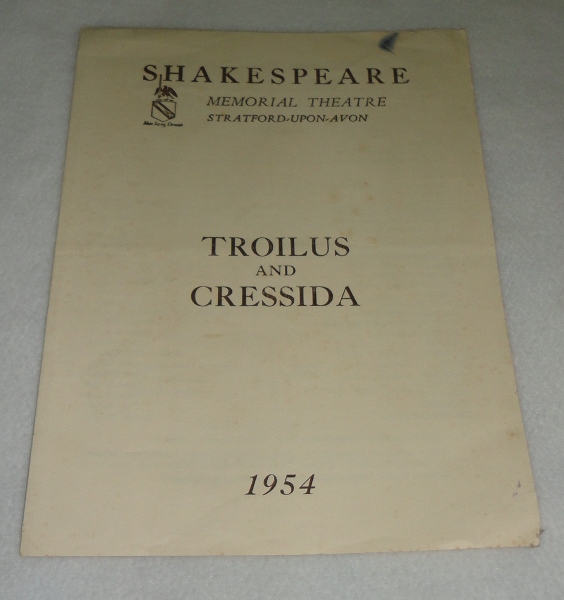 | 12369 | Shakespeare, William | Troilus And Cressida | Shakespeare Memorial Theatre Stratford Upon Avon | Fair to good. Ink stain bleed-through on the top of all 4 pages. Some soiling and creasing. | 7.5 x 10 inch program for Troilus And Cressida at the Shakespeare Memorial Theatre in Stratford Upon Avon. Mostly a list of the cast. | Ephemera, Shakespeare, Shakespeare Memorial Theatre, theater | $20 |