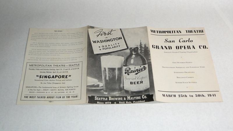 | 14079 | Metropolitan Theatre Seattle | San Carlo Grand Opera Co. | Metropolitan Theatre Seattle | Good. Light shelf wear and soiling | 17 x 8 inch, 2 folds on both sides, a playbill - program for the San Carlo Opera Company. There are ads, including Rainier Beer. | Ephemera, theatre playbill, Metropolitan Theatre, Seattle, Washington, San Carlo Grand Opera Co. | $20 |