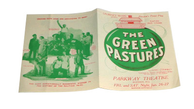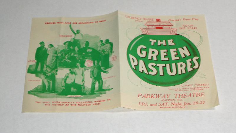 | 14081 | Rivers, Laurence | The Green Pastures Playbill | Laurence Rivers | Good. Has a sharp vertical crease. | 5 x 7 inches, a Parkway Theatere, Madison, Wis., The Green Pastures playbill for the 1930s | Theatre Playbill, The Green Pastures, Parkway Theatre, Madison, Wisconsin, ephemera | $20 |