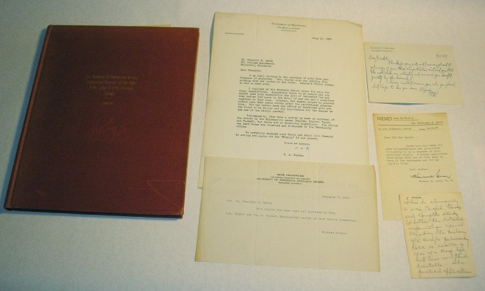 | 12478 | Smith, Franklin Robert, M. D. | An Analysis Of Variations Of The Segmental Bronchi Of The Right Lower Lobe Of Fifty Injected Lungs | Self-published | Good. The covers have some light scrape marks. This is a carbon copy. The tipped in plates/illustrations aren't carbon copies. | 8.5 x 11 inches doctoral thesis. There are tipped in plates and a bibliography. There are also five letters from other doctors including one snippy note from initials OTC? questioning whether this was worth one year of a man's life considering he, OTC, doesn't approve of pulmonary surgery for segmental resection. | Thesis, Franklin Robert Smith, pulmonary surgery | $40 |