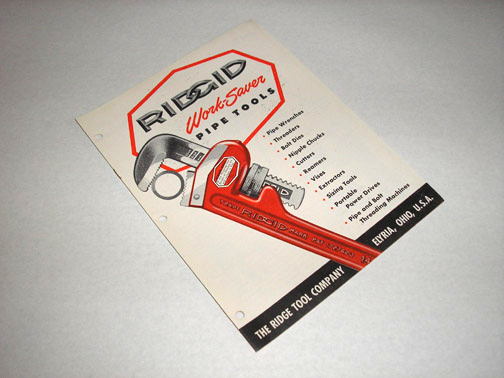 | 10997 | The Ridge Tool Company | Ridgid Work-Saver Pipe Tools | The Ridge Tool Company | Very good. The staples are rusty. | Circa 1950 8.5 x 11 inch stapled paperback with 16 pages and b&w photos. | Trade Catalog, The Ridge Tool Company, Pipe wrench | $20 |
