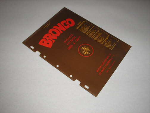 | 11004 | Western Insulated Wire Co. | Bronco Insulated Electrical Cords & Cables Catalog 501 Second Edition | Western Insulated Wire Co. | Good. Rusty staples. Small water stain on the bottom of the first 8 pages. | Circa 1950 Stapled paperback, 8.5 x 11 inches, with 24 pages and b&w illustrations. Trade Catalog | Trade Catalog, Western Insulated Wire Company | $20 |