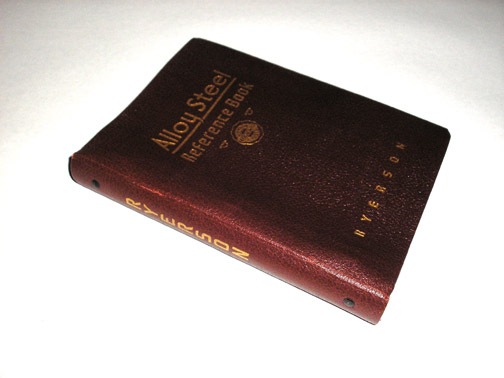 | 11008 | Ryerson | Alloy Steel Reference Book Second Edition | Joseph T. Ryerson & Son, Inc. | Very good with light shelf wear. Title page has a short tear and some creasing on the top. There is a rubber "engineering dept." stamp on the back page. | 1947 3 ring binder, hardback (Stiff leatherette), 6 x 9.5 inches, with 314 pages and an index. | Trade Catalog, Alloy Steel, Ryerson, reference | $20 |