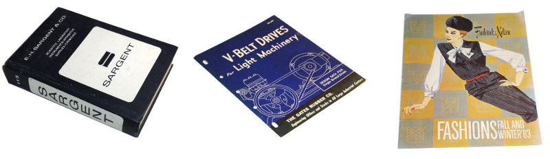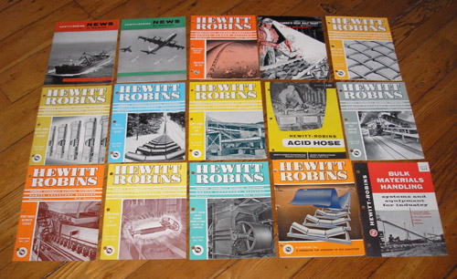 | 11787 | Hewitt Robins Staff | Hewitt Robins Trade Catalogs and Magazines | Hewitt Robins | Good. All these items have a musty smell -- like an old machine shop. Bulletin No. 140 has a few scrape marks on the front cover. | 13 trade catalogs, 2 company magazines,1955-1956 in this collection. Bulletin No. 113-A1, Woven Wire Screen Cloth, No. 140, The Main Catalog, No. 141, Conveyor Belting , No. 142, Belt Conveyor Idlers, No. 143, Pulleys, Bearings, Grease Fittings Collars and Couplings, No. 145, Takeups and Holdbacks, No. 146, Rotary Belt Cleaners, No. 147, Belt Conveyor Trippers, 149, Automatic Feeders, No. 151, Belt and Bucket Elevators, S-601, Acid Hose, H-22, "Here's One Belt That Is Fire Resistant!," 1029, Bulk Materials Handling, "Hewitt Robins News Of Industry" for July and Oct.,1956. | Hewitt-Robins, Conveyor, Trade Catalog | $40 |