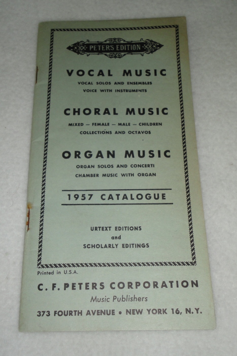 | 12133 | Peters, C. F. | Peters Edition Vocal Music Choral Music Organ Music 1957 Catalogue | C. F. Peters Corporation | Good. Light shelf wear, soiling and rusty staples. | 3.5 x 7 inch catalogue of sheet music. | Sheet Music, Trade Catalog, C. F. Peters | $20 |