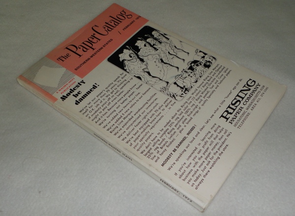 | 12347 | Rising Paper Company | The Paper Catalog Southern-Western States | Rising Paper Company | Good. Faint shelf wear on the covers. | 6 x 9 inches, a trade catalog for the Rising Paper Company, Housatonic, Massachusetts. There are lists of paper companies, their products and interesting ads. | Paper Companies, Rising Paper Company, trade catalog | $20 |