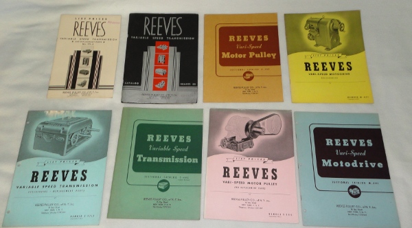 | 12358 | Reeves Pulley Co. | Reeves Trade Catalogs | Reeves Pulley Co. | Good. Faintly musty. One smaller catalog has water damage on the top of 8 pages. | Seven 8 x 10 catalogs from the Reeves Pully Co.. Number 99, Variable Speed Transmission from 1932 also has a price list. The rest of the catalogs are from the late 1940s. There are many b&w photos and illustrations. | Trade Catalogs, Reeves Pully Company | $50 |