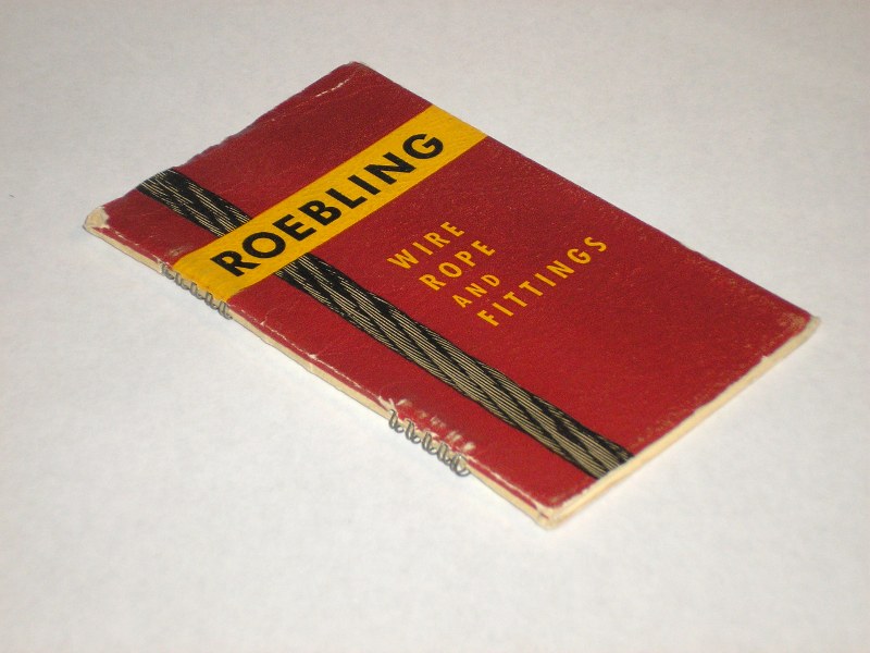 | 13324 | John A. Roebling's Son Co. | Roebing Wire Rope and Fittings (Condensed Edition) | John A. Roebling's Son Co. | Good. Shelf wear and soiling on the covers. The back cover has a 2 inch scrape mark. | 4 x 7 inch trade catalog with b&w photos tables and charts of the product. | Trade Catalog, Roebling Wire Rope | $20 |