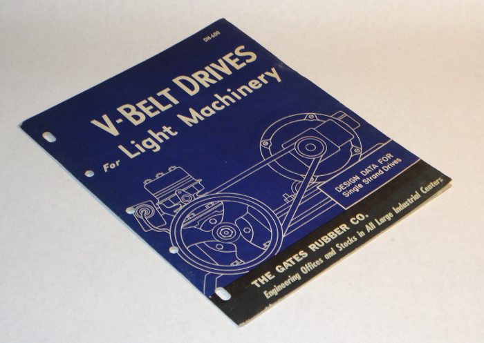 | 13469 | The Gates Rubber Co. | V-Belt Drives For Light Machinery DH-600 | The Gates Rubber Co. | Good. | 8.5 x 11 inches with b&w photos, many tables and other information. Design data for single strand drives. | Trade Catalog, The Gates Rubber Company | $20 |