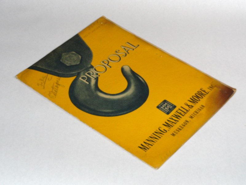 | 14945 | Manning, Maxwell & More, Inc. | Proposal Manning, Maxwell & More, Inc. | Manning, Maxwell & More, Inc. | Fair to good. The front cover has writing, soiling, staples and a smoke mark. The top of the back cover has a smoke mark. | 8.5 x 11.75 inches, a proposal from Manning, Maxwell & Moore of Muskegon, Mich., for the $28,000 installation of a Shaw-Box Crane. Literature is stapled in. | Shaw-Box Cranes, trade catalog, industrial equipment. | $30 |